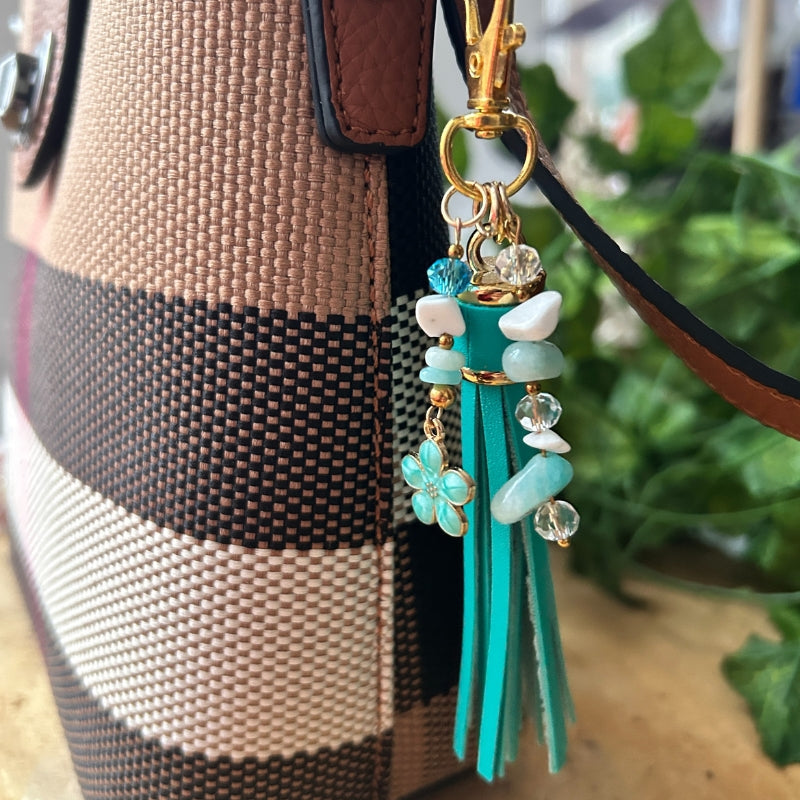 À accrocher Ă  ton sac, porte-clĂ©s ou trousse, ce talisman associe l’Amazonite, connue pour apaiser le stress, et l’Howlite, idĂ©ale pour calmer les tensions nerveuses.